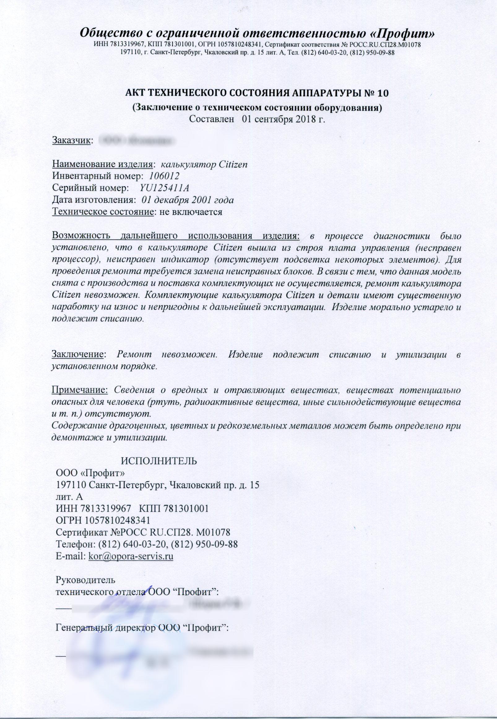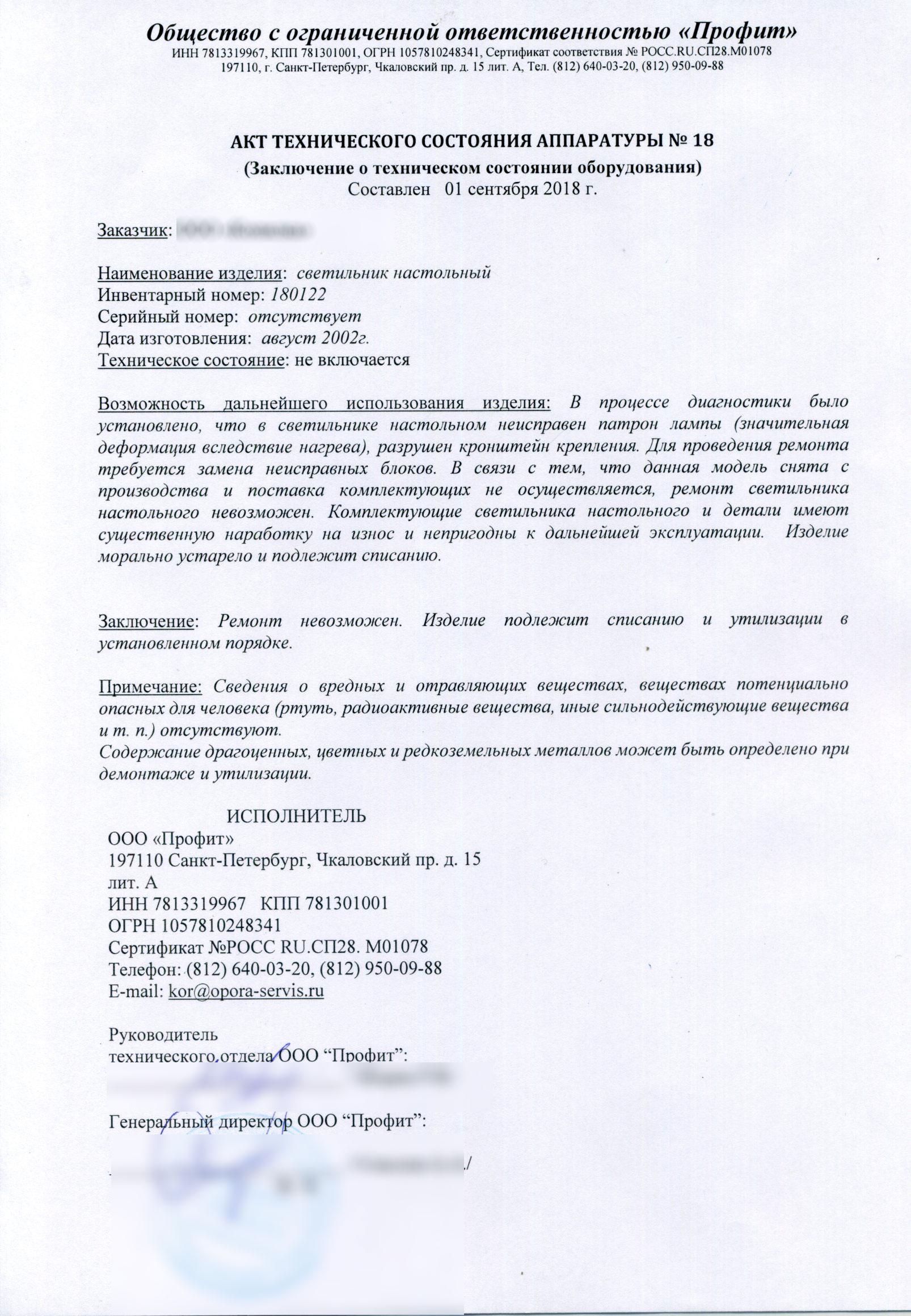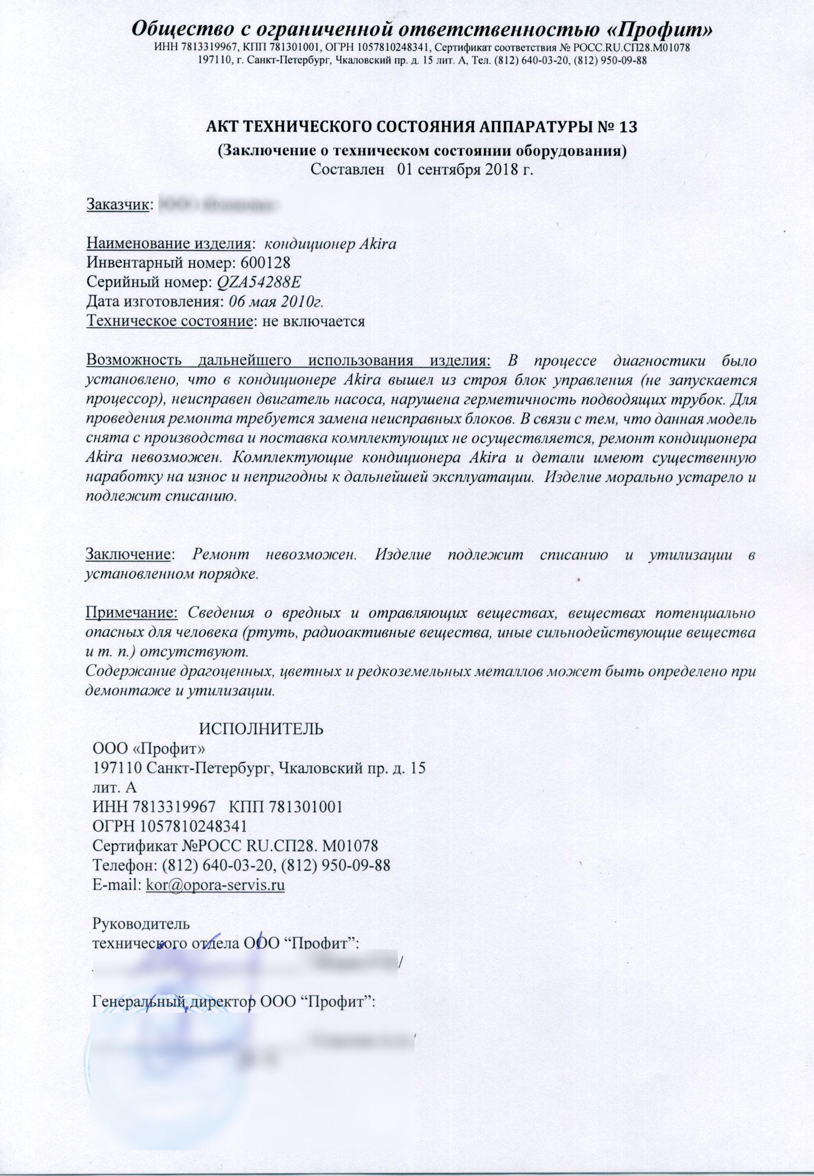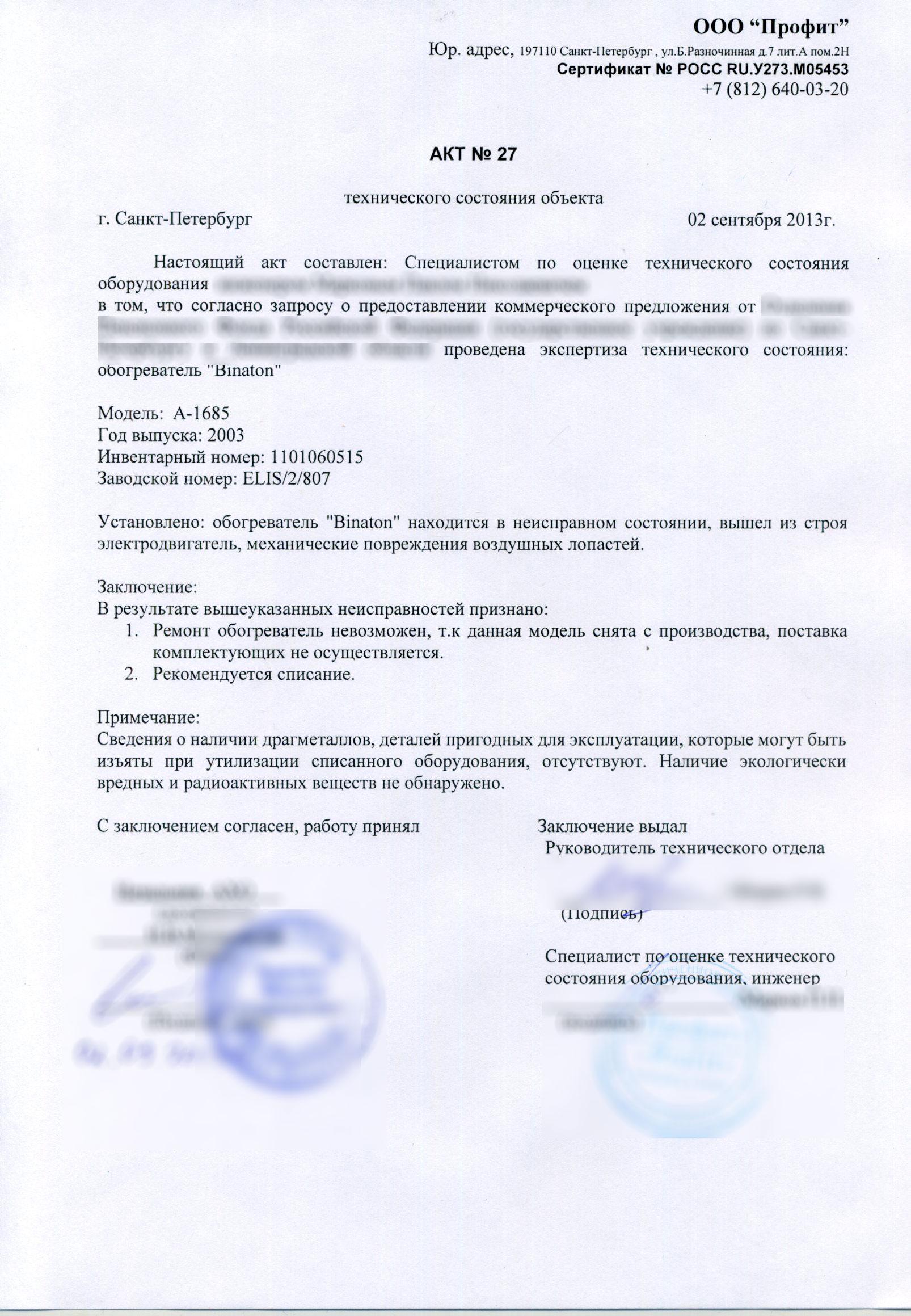 Образцы актов технического состояния оборудования для данной статьи предоставлены компаний ООО “Профит”.