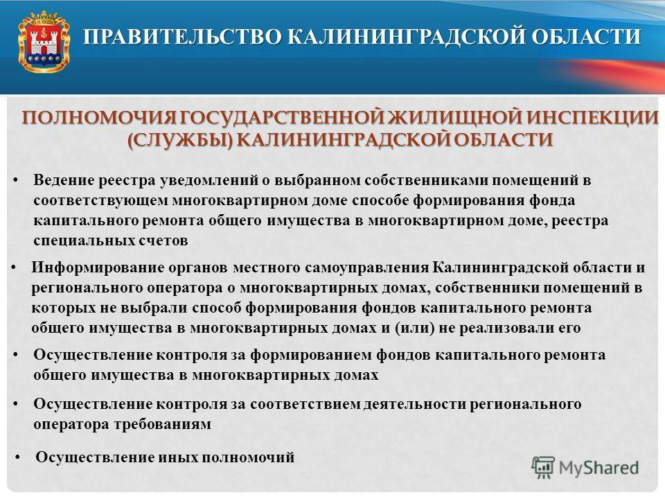 Перечень полномочий не исчерпывающий. Все они отражаются в документе, который называется положение о ГЖИ (Вот, например, положение о ГЖИ Санкт-Петербурга). Оно отрабатывается для каждого субъекта федерации, утверждается его правительством.