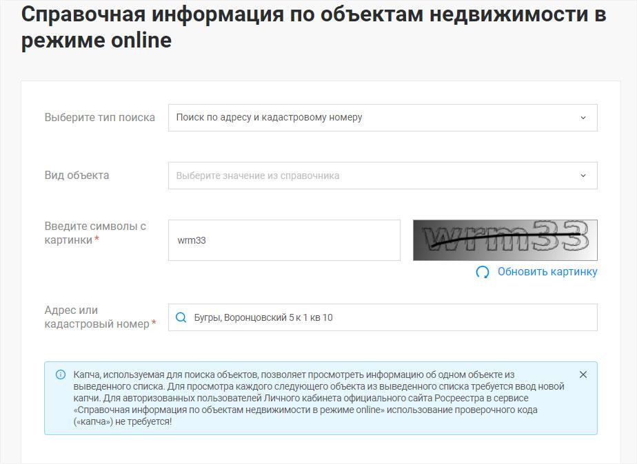 Вам будет необходимо предоставить информацию об объекте. Это может быть либо его кадастровый номер, либо адрес. Также потребуется пройти обычную процедуру проверки на безопасность (чаще всего это ввод капчи), чтобы удостовериться, что запрос выполняется человеком.