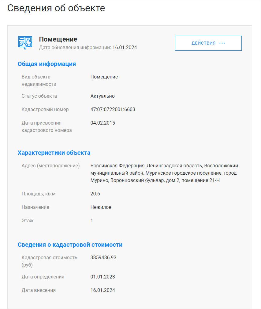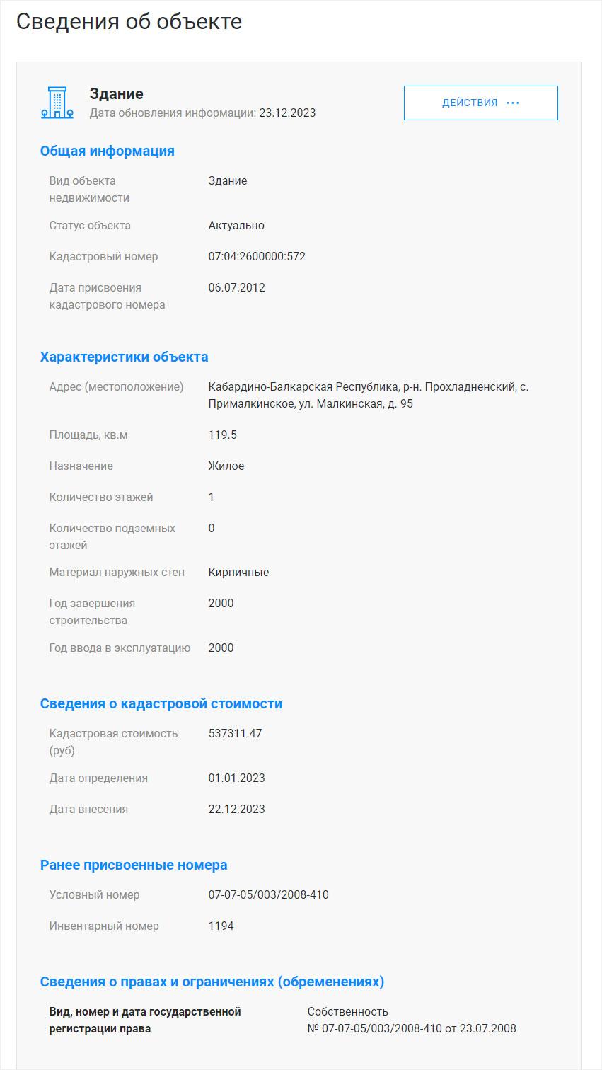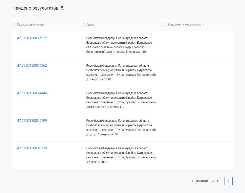 Как только вы введете необходимую информацию, на экране появится кадастровый номер, адрес и тип объекта недвижимости. Если вы кликнете на кадастровый номер, вы сможете просмотреть все доступные сведения о данном объекте.