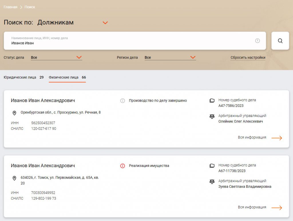 Если по введенным вами данным появляется запись, необходимо кликнуть на нее. Это даст возможность окончательно убедиться, что продавец действительно объявлен банкротом. После клика отобразится профиль должника, где будут указаны дополнительные сведения (например, ИНН). Получив эти данные, вы сможете быть полностью уверены в неплатежеспособности продавца и, соответственно, принять решение об отказе от покупки.