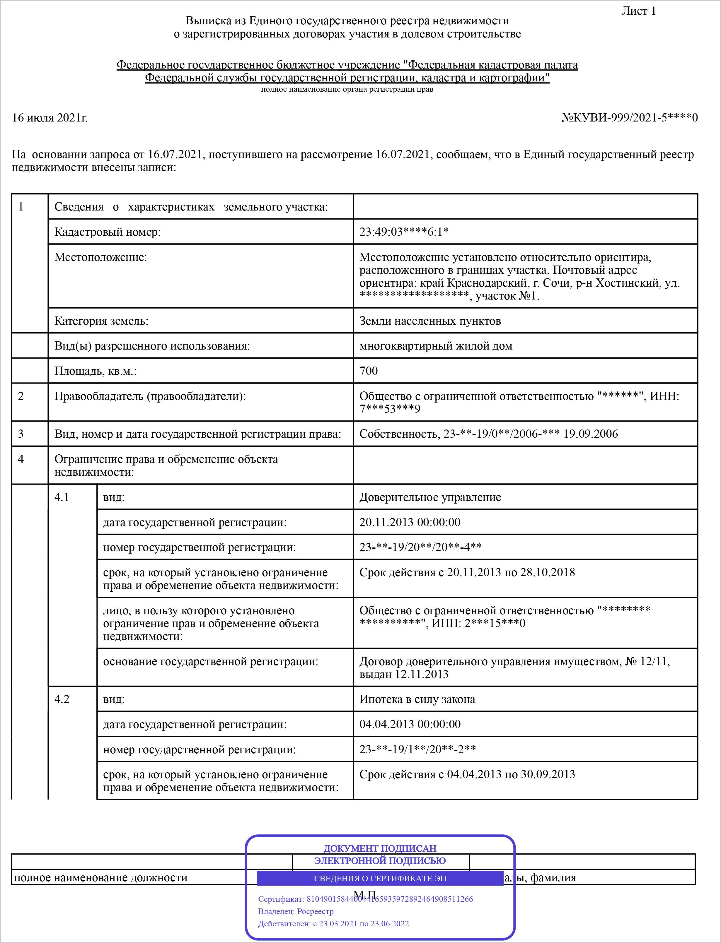 Выписка ЕГРН о ДДУ предоставляет данные о наличии обременений на участке, где происходит возведение многоэтажки. Она содержит данные о владельце участка — застройщике, участниках долевой собственности и номерах договоров по долевому участию для каждого дольщика. Эти данные открыты для общего доступа и могут быть получены любым заинтересованным лицом без необходимости иметь специальную доверенность от застройщика.