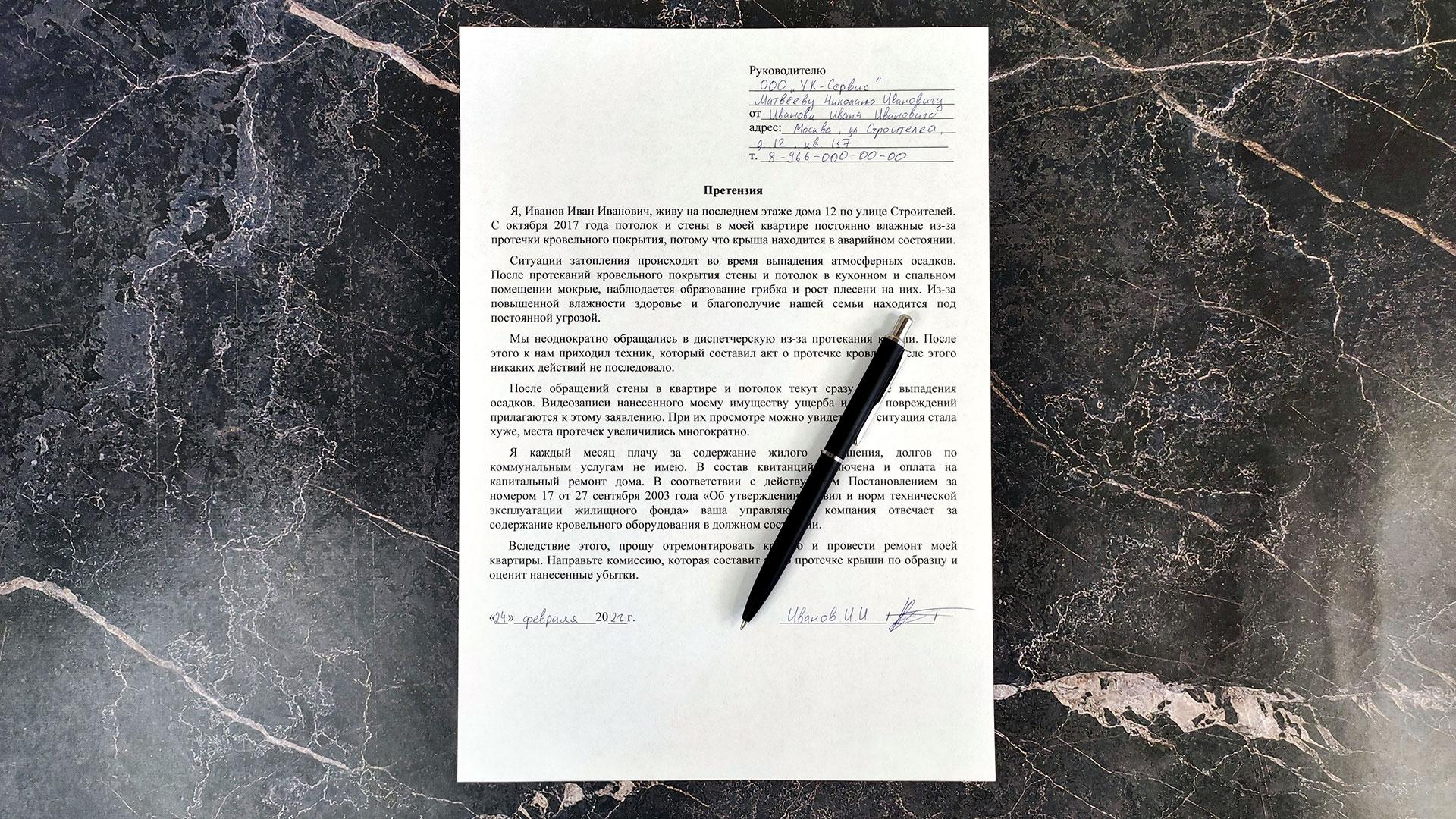 Образец претензии на протечку крыши можно подсмотреть в сети, на его основе составить собственный вариант. Какой-то установленной формы для документа не предусмотрено. Может писаться от руки или с помощью компьютерной техники.