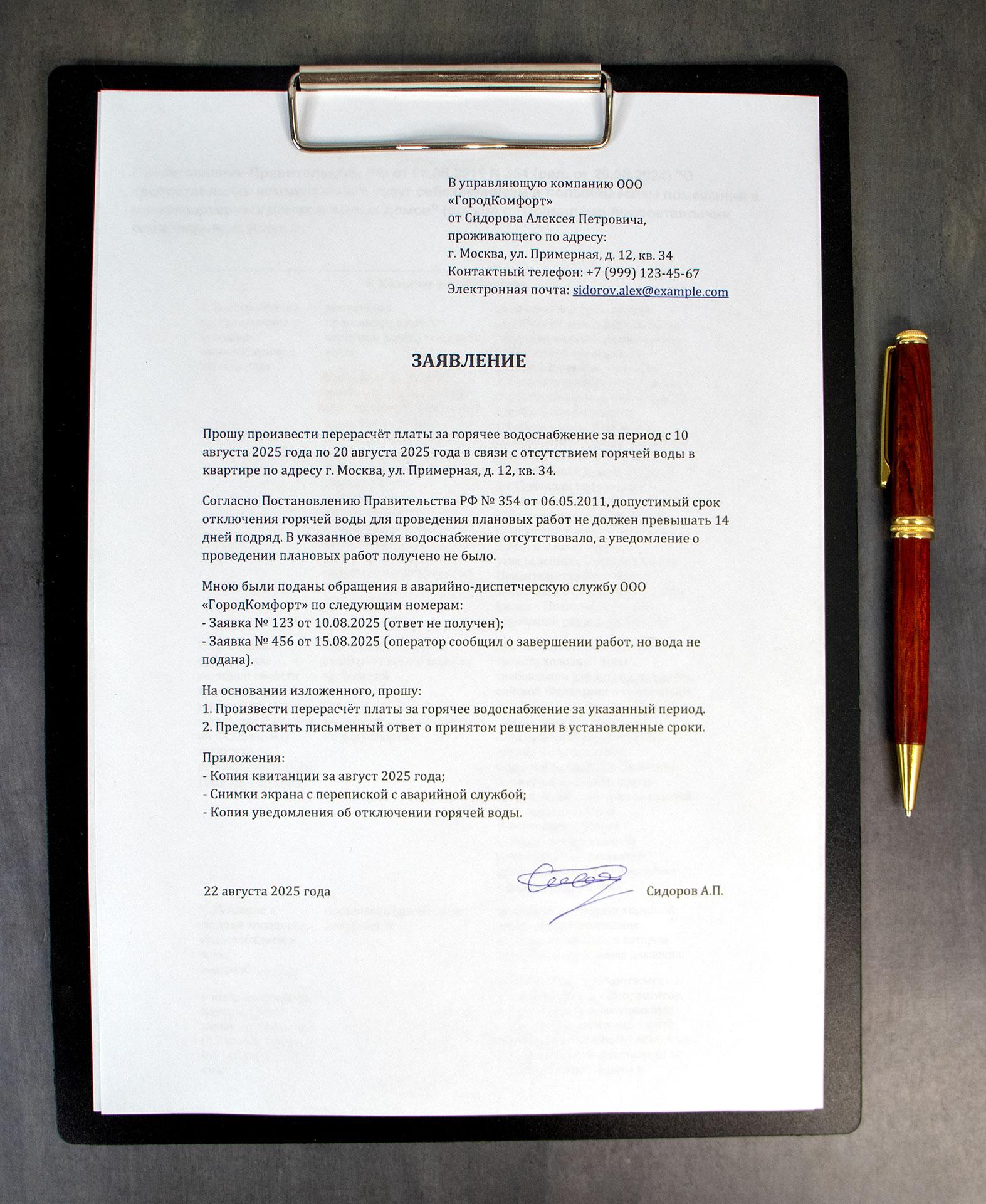 Чтобы инициировать перерасчёт платы за водоснабжение, необходимо сделать следующее:
