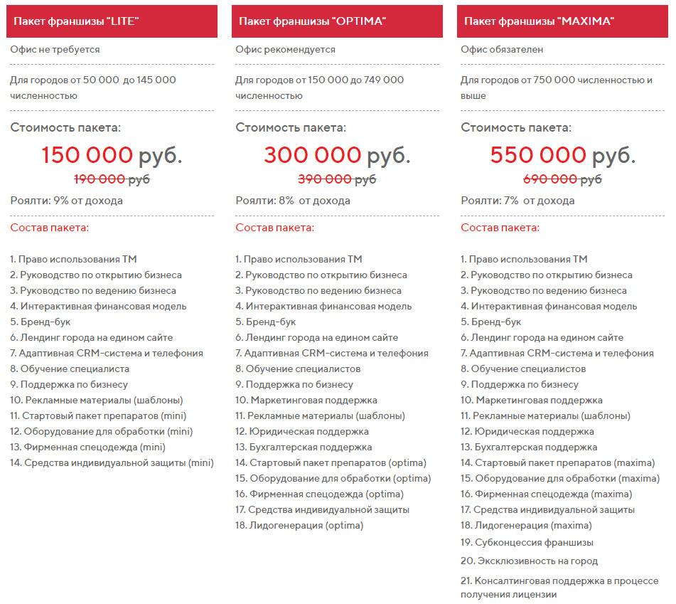 Приобрести франшизу можно в одном из трех вариантов пакетов: